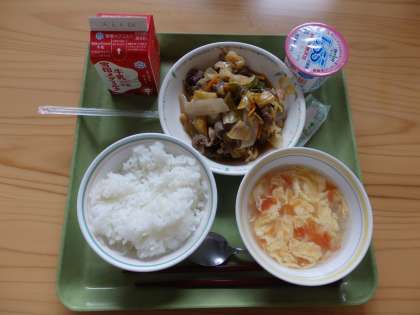 5月23日(金)今日の給食は,ごはん・牛乳・焼肉・トマトと卵のスープです。7〜9年生は,ヨーグルトがつきました。