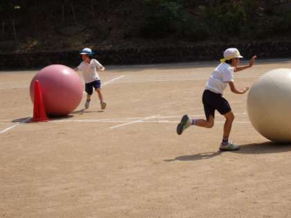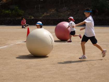 1年生から9年生までが,力を合わせて,リレー形式で競走しました。上級生はパワーあふれるころがし方でコーナーを回りました。低学年は,自分の体より大きな大玉を小回りをきかせて転がしました。