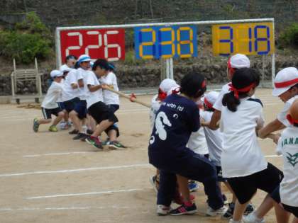 黄対青,青対赤,赤対黄の3回戦を行い,優勝チームを決めました。それぞれの対戦では,場所を交代して2回勝負しました。綱引きの優勝は,赤組でした。