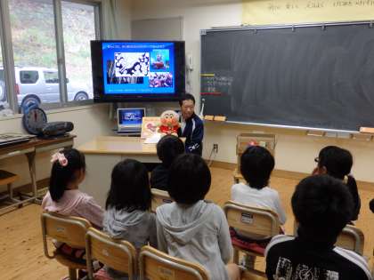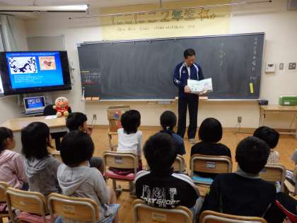 一期の子どもたちに,アンパンマンの人形や初期の絵本『あんぱんまん』の読み聞かせ,『アンパンマンの主題歌』や『手のひらを太陽に』の歌を交えながらお話していただきました。