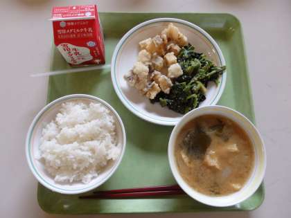 6月6日(金)今日の給食は,胚芽米ごはん・牛乳・たらのからあげ・ほうれん草のごま煮・みそ汁でした。