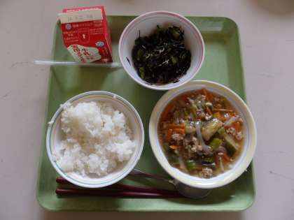 6月10日(火)今日の給食は,ごはん・牛乳・夏野菜のあんかけごはん(具)・小松菜とひじきのいためものでした。
