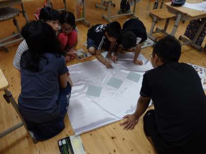 しおりをみながら,長期宿泊学習全般のことについて事前学習をした後,役割分担をしました。奥志摩みさきの家で毎日掲げる『花脊小中学校の旗』を作成しました。みんなで分担をし,旗を作成していきました。
