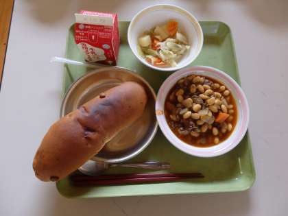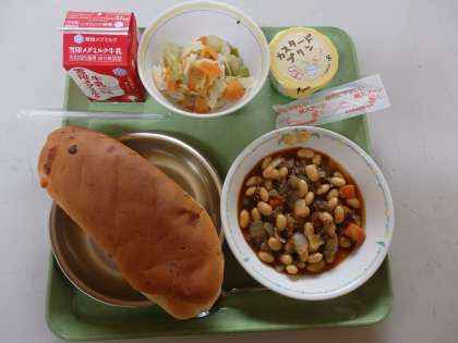 6月11日(水)今日の給食は,チーズコッペパン・牛乳・チリコンカーン・野菜のホットマリネでした。7〜9年生は,プリンがつきました。