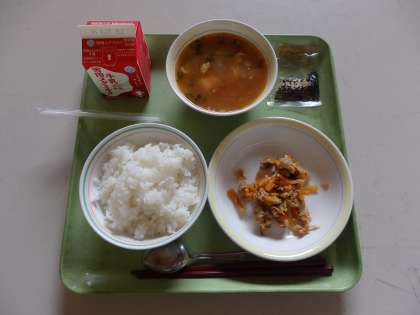 6月13日(金)今日の給食は,ごはん・牛乳・ツナそぼろ丼(具)・トマトだご汁でした。