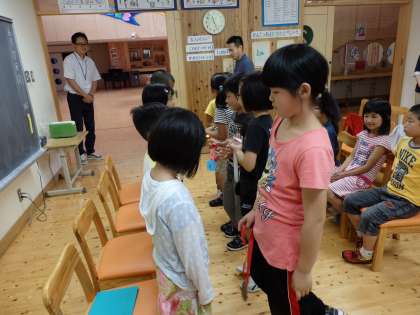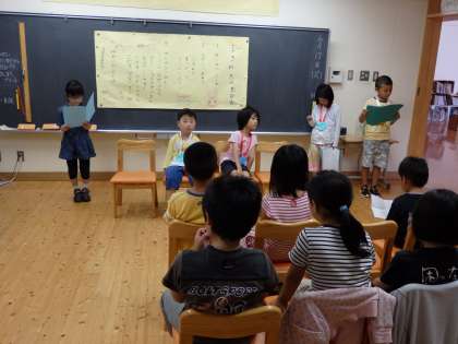 お楽しみのゲームが終わって,ハピィバースデーツゥユーの歌を一人一人に歌いました。4人の子どもたちがプレゼントのメダルをもらいました。今回のメダルは,4年生の子どもたちが作ってくれました。最後におわりのことばでしめくくりました。とても楽しい会になりました。