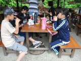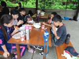 2日目(18日)朝ごはんはパックドックをいただきました。牛乳パックにアルミホイルに包んだパンを入れパックごと燃やして作りました。おいしくいただいています。