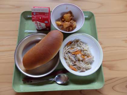6月18日(水)今日の給食は,味つけコッペパン・牛乳・豚肉のケチャップ煮・たっぷり野菜のビーフンでした。