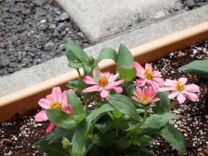 花いっぱいの学校にしようということで,いろいろな花を植えました。その中の一つにジュニアプロフージョンの花があります。大きくて鮮やかな花なので,モンシロチョウがやってきたのでしょうか。