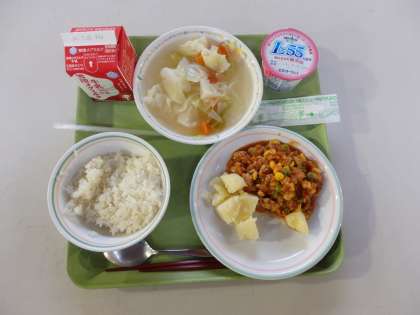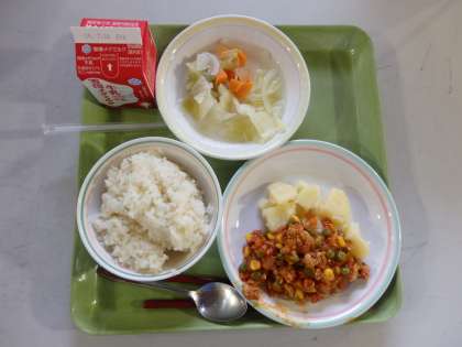 7月7日(月)今日の給食は,麦ごはん・牛乳・チキンライス(具)・粉ふきいも・野菜のスープ煮でした。7〜9年生には,ヨーグルト(オハヨー)がつきました。