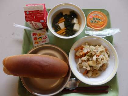 7月9日(水)今日の給食は,黒糖コッペパン・牛乳・ソーセージと野菜のいためナムル・とうふと青菜のスープ・チーズでした。7〜9年生には,みかんゼリーがつきました。