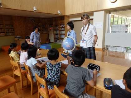 7月15日(火)4時間目に,3・4年生がデンマークからの留学生とみんなのリビングで,国際交流をしました。留学生は,1年前にデンマークから日本へ来て日本の家庭にホームステイしています。