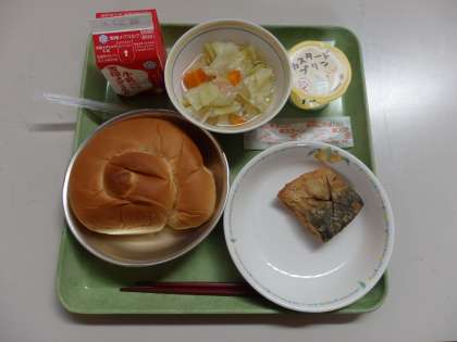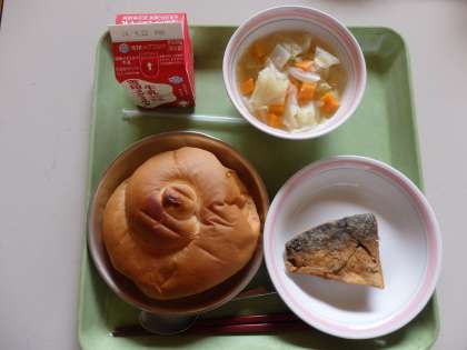 9月10日(水)今日の給食は,バターうずまきパン・牛乳・さばのカレーあげ・野菜のスープ煮でした。7^)年生には,(冷)プリンがつきました。