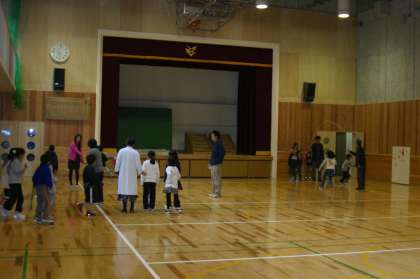体育館で大なわやリレーをした後,
