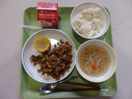 10月2日(木)今日の給食は,麦ごはん・牛乳・和風ドライカレー・カットコーン・スープでした。7〜9年生には,ヨーグルトがつきました。