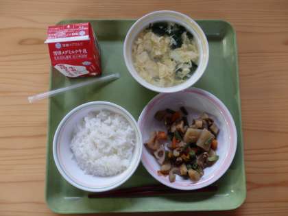 10月8日(金)今日の給食は,ごはん・牛乳・筑前煮・かきたま汁でした。7〜9年生には,じゃこがつきました。