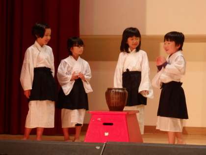 おしょうさん・こぞうさん・おきゃくさんなどが衣装を着て練習をしました。衣装の着方や片づけ方も練習し,いよいよ本格的になってきました。