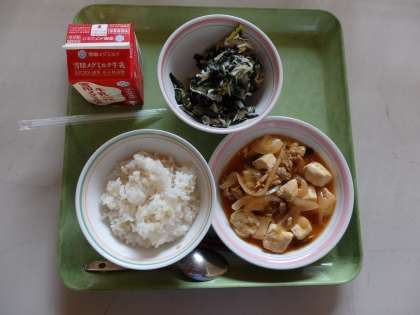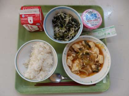 10月10日(金)今日の給食は,玄米ごはん・牛乳・とうふの四川風・切干大根のナムルでした。7〜9年生には,ヨーグルトがつきました。