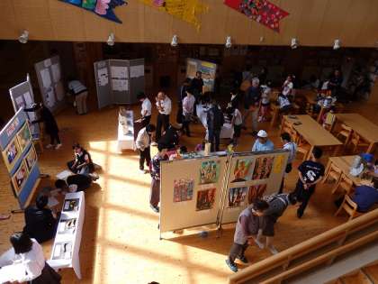 10月11日(土)文化祭を行いました。上の写真は,午前の部が終わり,みんなで展示鑑賞をしているところの様子です。
