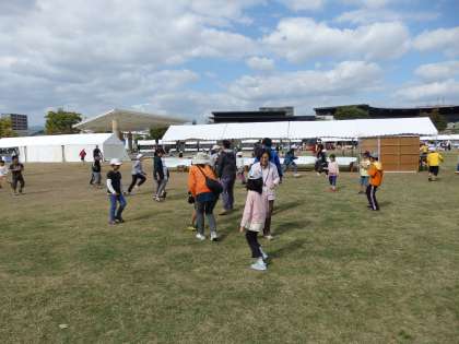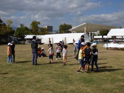 お弁当タイムの後,芝生広場で集団ゲームをしました。おににウインクをされた人は,3秒後に『やられた〜』と言って倒れます。他の人は,誰がおにかを見つけるゲームでした。最初はルールがわからなかった子どもも,ルールがわかると楽しくなってきたようで何度もやりたいと言ってきました。