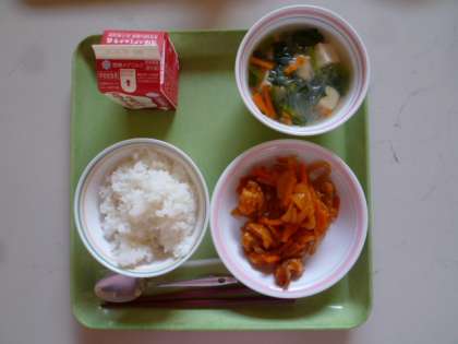 10月17日(金)今日の給食は,ごはん・牛乳・たらのピリカラいため・とうふのスープでした。