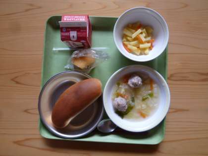11月5日(水)今日の給食は,ミルクコッペパン・牛乳・肉だんごのスープ・じゃがいものピリカラいため・柿でした。