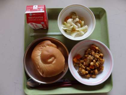 11月12日(水)今日の給食は,バターうずまきパン・牛乳・チリコンカーン・カリフラワーのホットマリネでした。7〜9年生には,チーズがつきました。