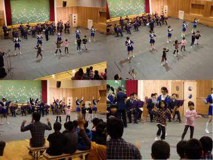 2曲目は,『サントワマミー』の演奏で,なつかしい曲で,地域の方には大好評でした。3曲目は,『妖怪ウォッチメドレー』で,カラーガード隊も子どもたちも一緒に踊りました。4曲目は,RPG(クレヨンしんちゃん)でした。3曲目・4曲目は,子どもたちには大好評でした。