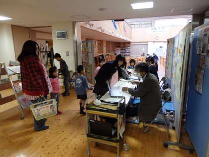 1か月に一度やってくるこじか文庫のバスを子どもたちはとても楽しみにしています。今日もたくさんの子どもたちが本を返したり借りたりしていました。
