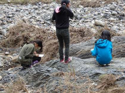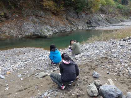 なぜこのようになったのかを考えながら,地層をみました。河原にある石も観察し,堆積岩や火成岩について知りました。