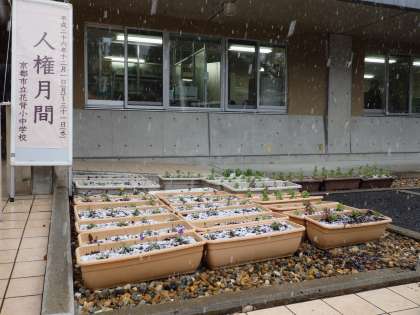 12月15日(月)花背に雪がふりました。午前中,冷え込んで雪がふってきました。つもることはありませんでしたが,運動場やプランターには,昨日ふった雪が残っていました。