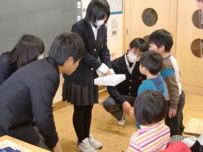 2月4日(水)5時間目に,9年生と1年生がふれあい学習を行いました。9年生が家庭科の時間に作ったしかけ絵本の読み聞かせをしました。しりとり絵本や影絵絵本など楽しいしかけがいっぱいの絵本に子どもたちは大興奮。絵本の読み聞かせが終わると,段ボールや廃材などを使って作ったエコおもちゃで遊びました。1年生と9年生が一緒に遊ぶ姿は微笑ましいものでした。