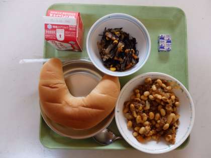 2月4日(水)今日の給食は,クロワッサン型バターロール・牛乳・チリコンカーン・ひじきのホットマリネでした。7〜9年生には,チーズ(角)がつきました。