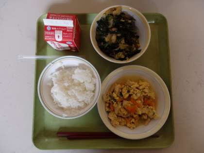 2月17日(火)今日の給食は,ごはん・牛乳・あげたま煮・ほうれん草とはくさいのごま煮でした。
