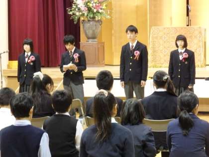 国歌・校歌斉唱に引き続き,卒業証書を9年生一人一人に授与しました。学校長祝辞・来賓祝辞の後,在校生送辞・卒業生答辞がありました。卒業式の唄・蛍の光を歌いました。