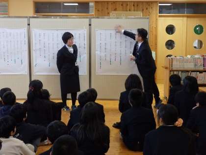2月25日(水)6時間目に,冬の俳句集会を行いました。事前に,俳句を掲示し,自分が気に入った俳句を期ごとに選んでおき,自分が気に入った俳句に投票しました。9年生から順に,自分が一番気に入った俳句となぜその俳句を気に入ったのかを発表しました。その後,自分の俳句も披露し,工夫したことや苦労したことを発表しました。保護者の方にも参観していただきました。