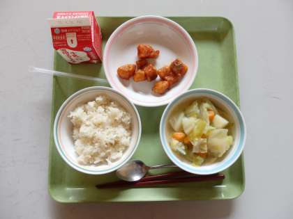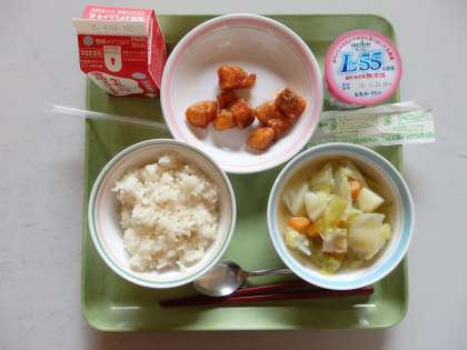4月16日(木)今日の給食は,麦ごはん・牛乳・たらのアングレス・春野菜のスープ煮でした。7〜9年生には、ヨーグルトがつきました。