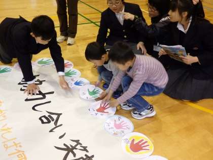 生徒会が作成したスローガンのまわりに,一人ずつが事前に作成した手形をはっていきました。