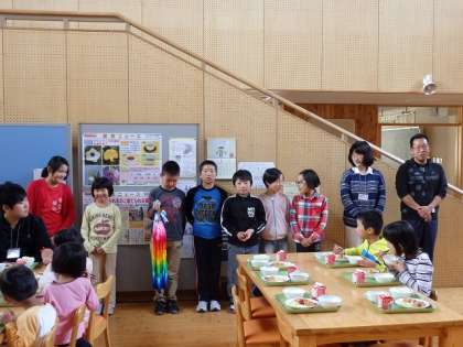5月11日(月)給食時間に,5・6年生が学習旅行へ行く報告と,千羽鶴協力のお礼を言いました。