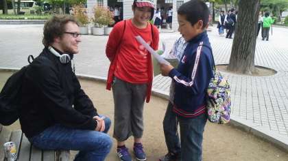 平和記念公園では,外国語活動で学習してきたことをもとに,外国から来られた方に,英語でインタビューをしました。『どこからこられましたか?』などの質問をしました。
