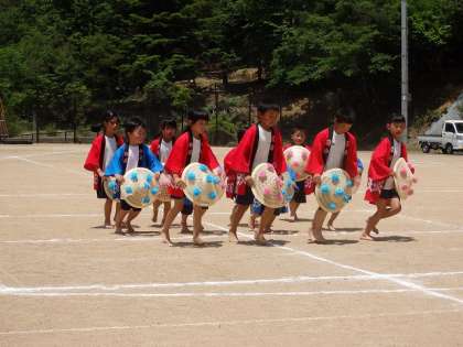 午前の部の最後は,プログラム11番,一期(1〜4年生)の子どもたちによる団体演技『花笠音頭』でした。