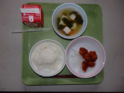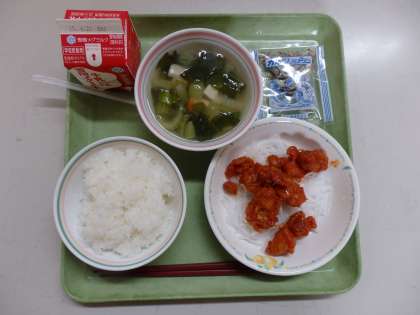 6月9日(火)今日の給食は,ごはん・牛乳・鶏肉のチリソース・パリパリはるさめ・とうふと青菜のスープでした。7〜9年生には、じゃこがつきました。