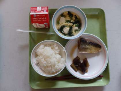 6月12日(金)今日の給食は,ごはん・牛乳・にしんなす・かきたま汁でした。7〜9年生には,ヨーグルトがつきました。