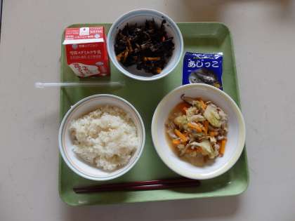 豚肉とキャベツのみそいためは,味つけもちょうどよい濃さでごはんがすすみました。ひじきの煮つけは,あっさりしていて食べやすくおいしかったです。