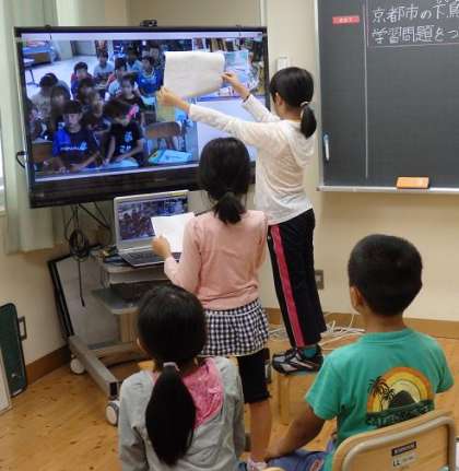 社会科で学校のまわりの様子を学んできました。その学びの結果を30日(火)に京都市の南部にある下鳥羽小学校の3年生と交流しました。今回の交流の方法は,直接会って話すのではなく,「テレビ会議」というシステムを使った方法です。多様な人と関わる機会が増える大きなチャンスです。