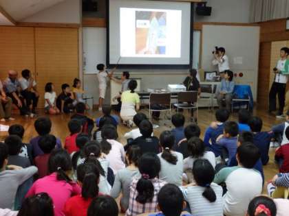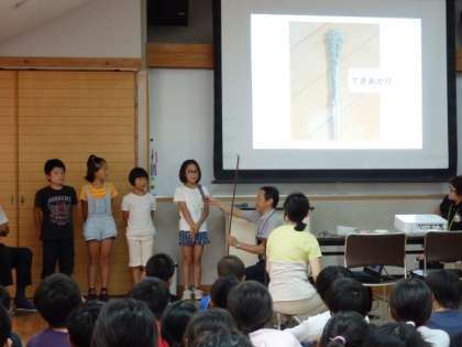 両校の紹介の後,花背小中学校の5年生が,厄除けチマキの作り方の説明をしました。厄除けチマキは,高倉小学校と花背小中学校をつないでくれているものです。