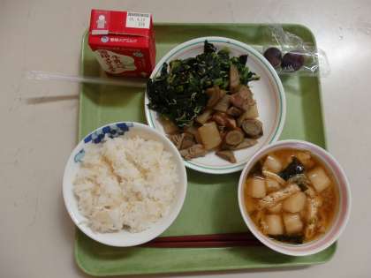9月11日(金)今日の給食は,玄米ごはん・煮しめ・ほうれん草とじゃこのいためもの・みそ汁・ぶどうでした。7〜9年生には,牛乳がつきました。