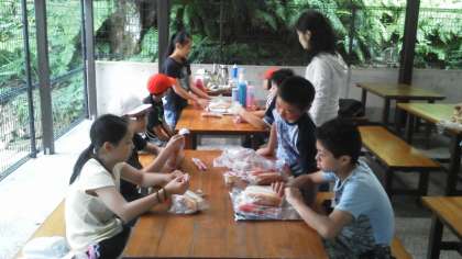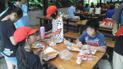 7月6日(水)第2日目,朝のつどいがおわり今日の朝食,パックドックづくりをしました。パンに具材をはさみ,アルミホイルに包んで牛乳パックに入れ,牛乳パックを火で燃やしました。