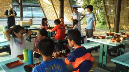 東屋で,夕食をいただきました。今日も,いろいろな活動をしてお腹がへっていて,とてもおいしくいただきました。