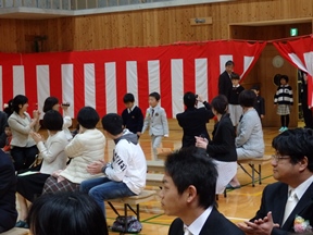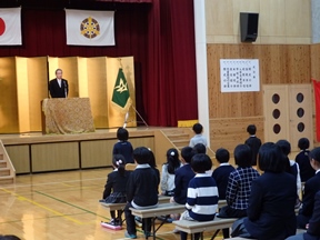 着任式・始業式が終わったあとの午前10時、多くのご来賓ならびに保護者の皆様、在校生の拍手に迎えられ、4年生に手をひかれた3名の入学生が体育館に入場してきました。3名とも少し緊張気味でした。新入生の皆さん、ようこそ花背小中学校へ。教職員一同皆さんのご入学を心待ちにしていました。今日から花背小中学校の1年生です。9年生までのみんなと仲良くしましょう。そして、しっかりと勉強をしていきましょう。がんばってくださいね。ご入学おめでとうございます。